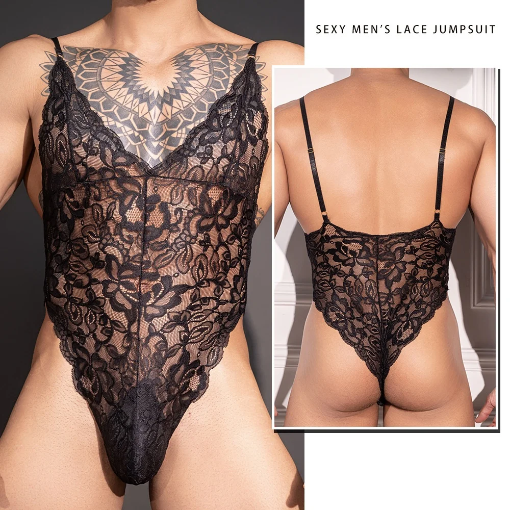 Lace-trimmed sexy bodysuit for men